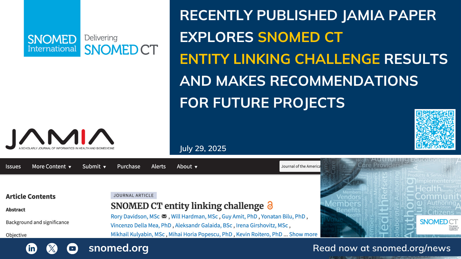 SNOMED International, along with a team of research and technology focused subject matter experts, recently contributed to a research paper documenting the development of entity linking models to link spans of free-text data in clinical notes with specific topics in the clinical terminology SNOMED CT. The paper, which had been planned as part of the competition, was recently published in the highly respected, peer-reviewed Journal of the American Medical Informatics Association, the outcomes of which were derived from SNOMED International’s Entity Linking Challenge held in 2024.